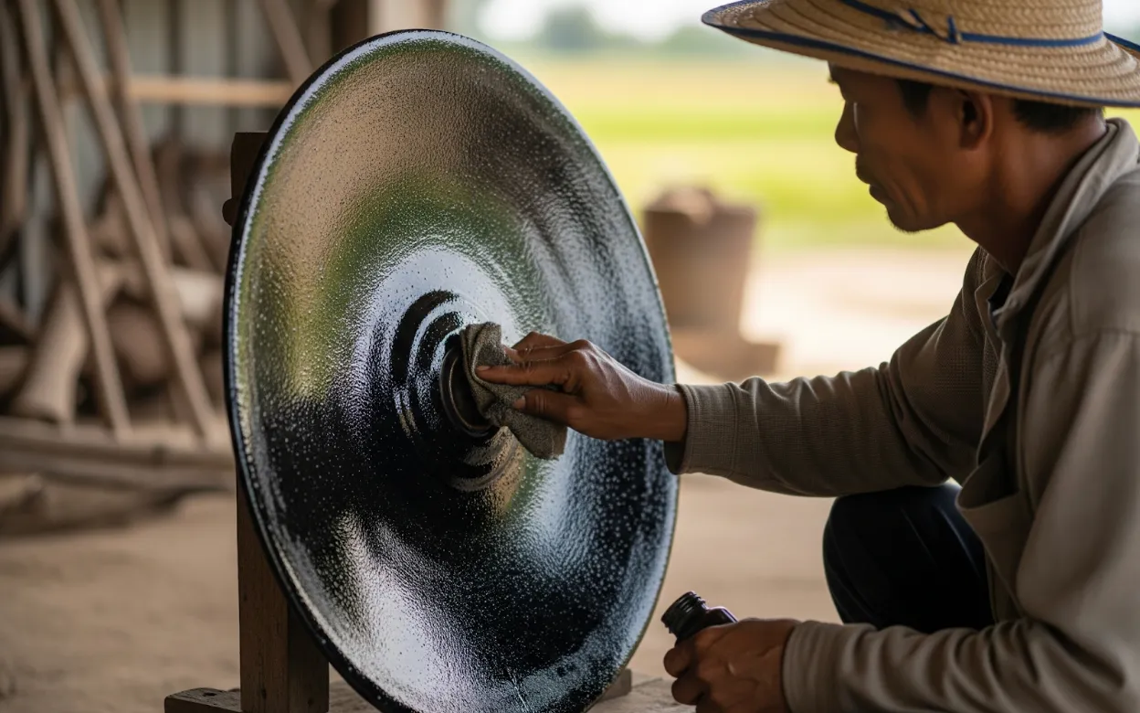 ขั้นตอนต่อมาคือ ทาน้ำมันกันสนิมจานไถ ซึ่งสามารถใช้น้ำมันทั่ว ๆ ไปอย่างน้ำมันเครื่อง หรือน้ำมันหล่อลื่นได้ โดยให้ทาทันทีหลังจากเช็ดจานไถแห้งแล้ว เพื่อให้น้ำมันเคลือบเหล็กดี